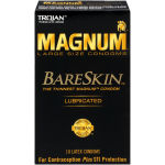 Trojan MAGNUM BareSkin Large Size Lubricated Condoms are designed to provide heightened sensitivity and comfort. They are 20% thinner and 18% wider toward the tip than regular MAGNUM lubricated condoms. Latex condoms are intended to prevent pregnancy, HIV/AIDS, and other sexually transmitted infections.